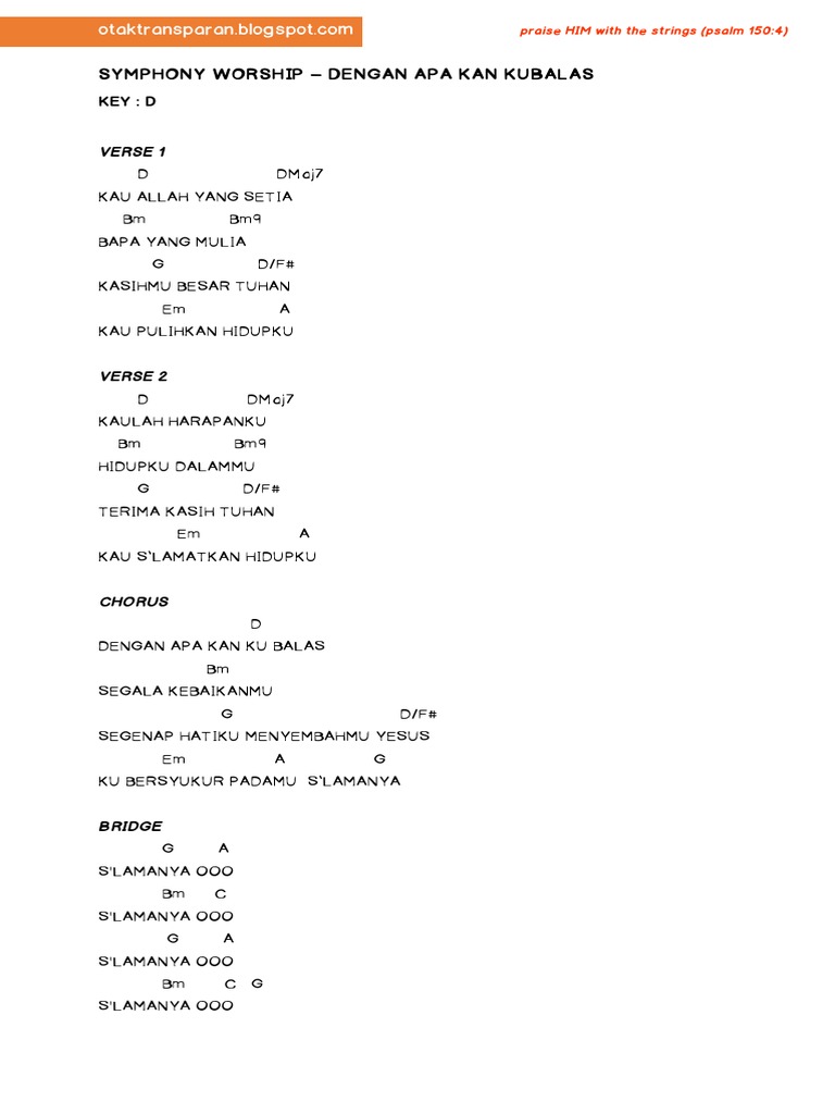 Lirik Lagu Dengan Apa Kan Ku Balas. Chord Lagu Dengan Apa Kan Kubalas Symphony Worship Original chord. G A Bm Fm G A FBb Bm Em A D Bait.