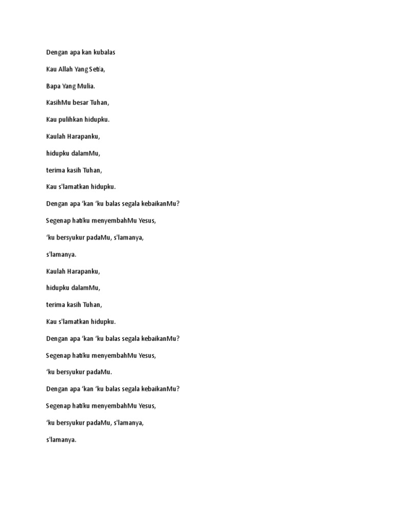 Dengan Apa Kan Ku Balas Segala KebaikanMu Segenap Hatiku MenyembahMu Yesus Ku Bersyukur PadaMu Slamanya Bridge. Kau Allah Yang Setia Bapa Yang Mulia KasihMu Besar Tuhan Kau Pulihkan Hidupku Kaulah Harapanku Hidupku DalamMu Terima Kasih Tuhan Kau Slamatkan Hidupku Reff. Dengan apa kan ku balas Segala kebaikan-Mu.